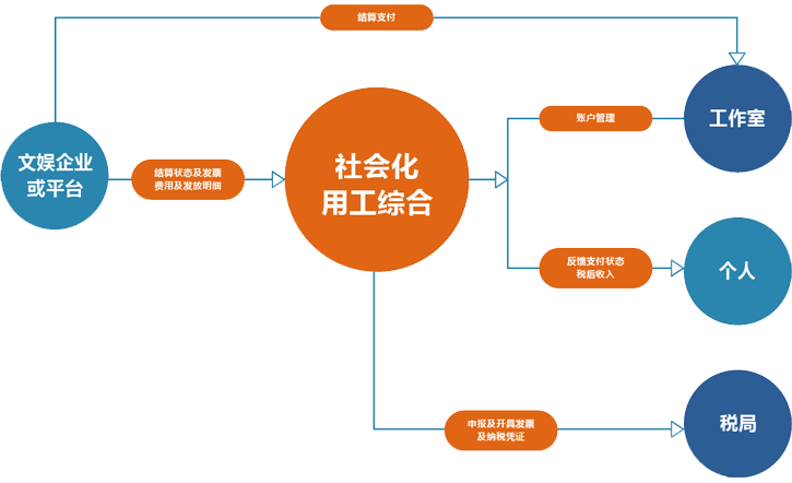 某影视集团注册资金5000万元以影视剧、综艺、MCN业务为核心;改善不合规的用工关系带来的法律风险,合规完税保障支付结算符合监管要求,实现财税合规;填补过高的人工成本带来的人才缺口,解决不定时、高频次结算,提高运营效率。